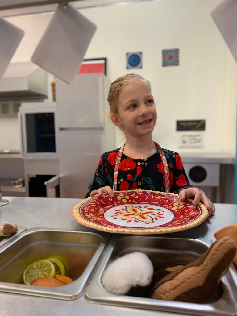 During our latest visit, Talia cooked and served food to me at a Moroccan restaurant. The theme and decorations were recently updated from a German restaurant, and the details are impressive. The dishware, menu, pretend food, and wall colors were all changed. In the kitchen, there are recipe cards explaining how to prepare authentic Moroccan dishes, with all the ingredients available. Even the drink labels on the pretend soda fountain had been updated. This attention to detail is what makes Pretend City magical for little ones. To them, it feels very real.