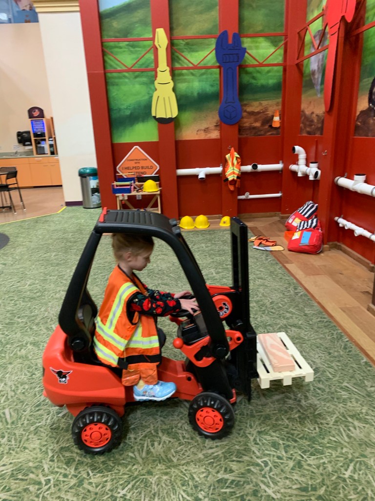 A laminate floor road runs along the ground, as you travel from a Trader Joe’s complete with child-sized shopping carts and cash registers, to a farm with plenty of produce to grow and pick, to a construction site prepped with building supplies, and a stage ready with instruments and costumes. A UPS Store and a restaurant have realistic storefronts alongside a fire station and police station. There is even an art studio offering various projects and art supplies which rotate daily.